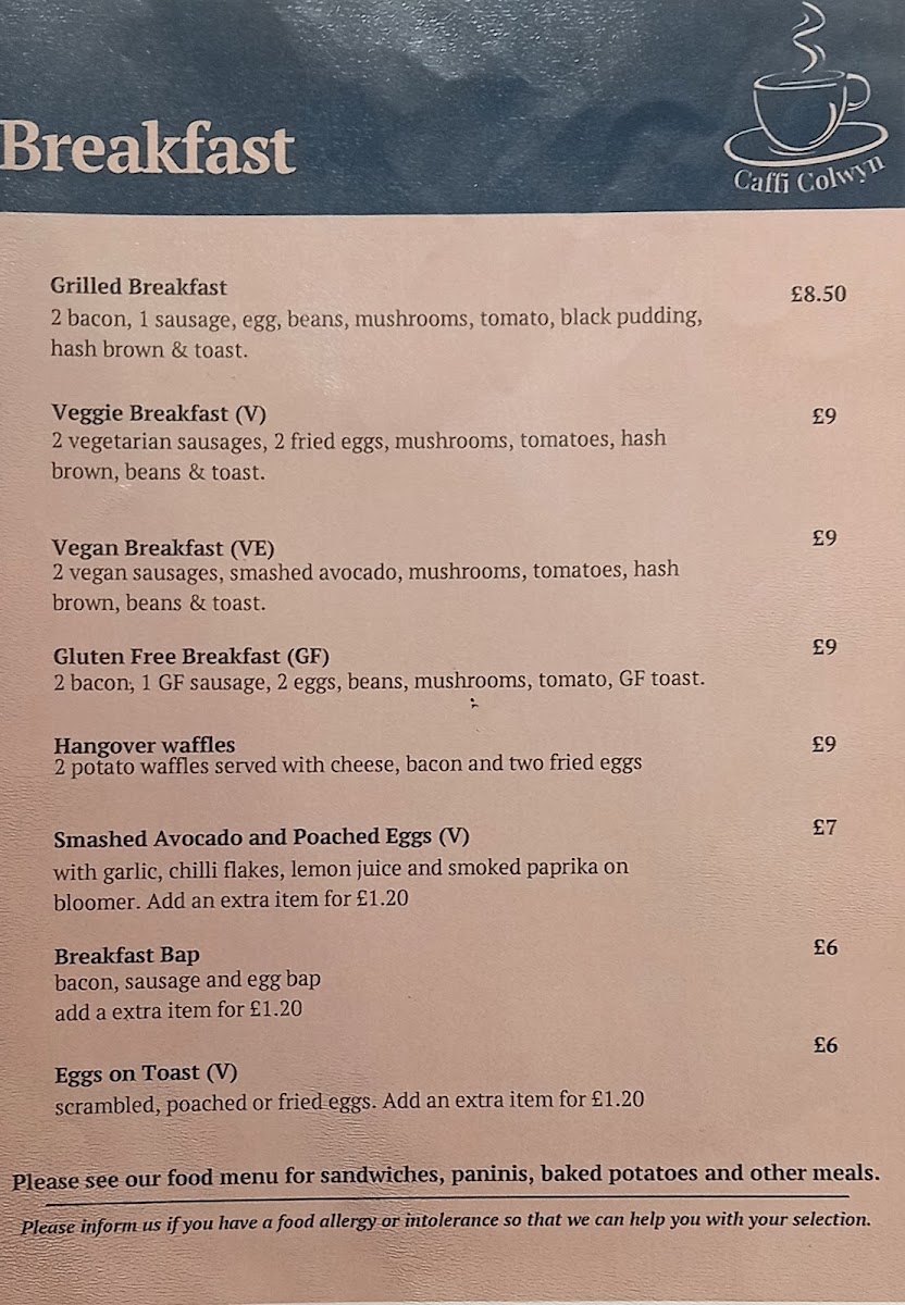 “ Lovely cafe serving a great breakfast and a gluten free breakfast. We also purchased our lunch to takeaway. Everything tasted lovely. All the staff are friendly and attentive. 5 out of 5 stars !! Well done "Caffi Colwyn". Will definitely return. ”